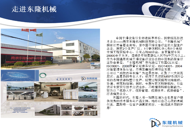 公司主要從事干燥、制粒、包衣、混合類設(shè)備和配料等系統(tǒng)成套設(shè)備的制造,公司擁有強(qiáng)大的非標(biāo)設(shè)備設(shè)計、制造及工程能力,成果頗豐,業(yè)績卓著。